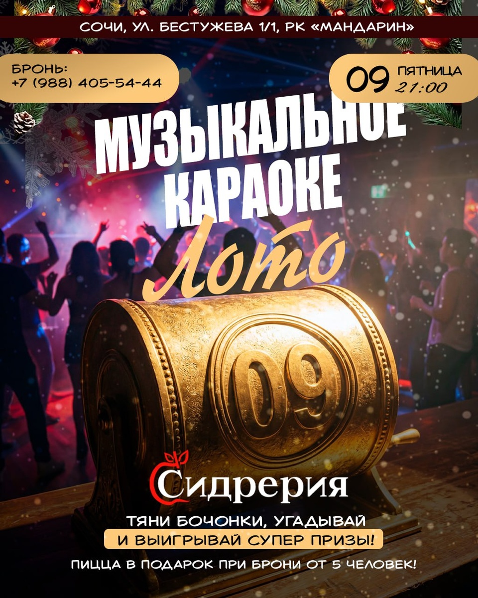 + в СИДРЕРИИ 🕘 Начало в 21:00 Если угадываешь — пьёшь. Если не угадываешь — всё равно пьёшь 😁 9 января в Сидрерии — алкогольное караоке лото, проверенное средство от зимней хандры. 🎧 90 треков — от «ой, что это?!» до «я точно это знаю!» 🍸 Шоты и коктейли за правильные ответы 🎲 Бочонки, азарт и подарки 🔥 Шумно, весело и очень по-праздничному Акции вечера: 🎁 -10% именинникам 🍎 Фруктовая тарелка при бронировании до 20:00 🍕 Пицца в подарок при бронировании от 5 человек (акции не суммируются) Предупреждаем: уходят отсюда счастливыми и очень веселыми 😌 🤩 +7 (988) 405-54-44 🤍Сочи, ул. Бестужева 1/1, РК «Мандарин» 🤍По вопросам сотрудничества: @oleg_groom