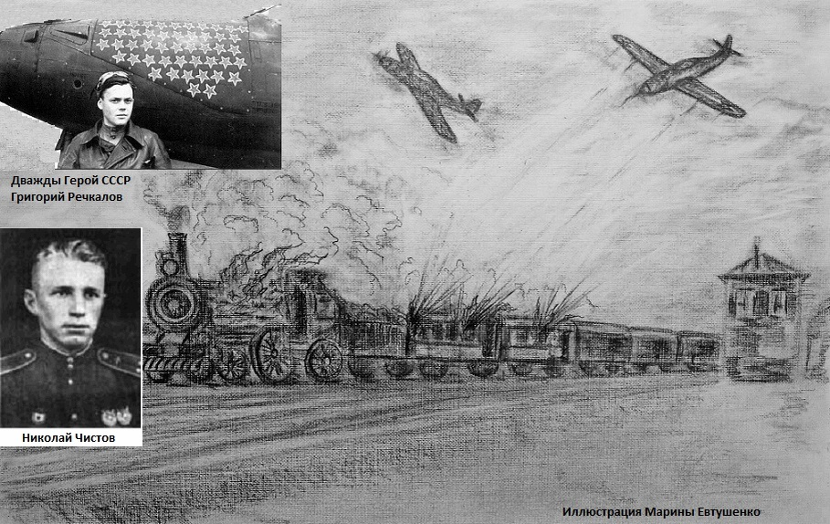 Речкалову стало понятно, почему здесь барражировали мессершмитты. Они прикрывали с воздуха танки. Передав по радио информацию, они на бреющем полете пронеслись над танками, а затем круто набрали высоту. А это что? Внизу слева от них на запад полз длинный железнодорожный состав. Интересно, что это фрицы вывозят. Два вагона пассажирских, остальные – теплушки. В комфортабельных пассажирских вагонах могут быть раненые, едущие в тыл офицеры. А в теплушках – скот, награбленные ценности или просто люди, которых фашисты угоняют в Германию в качестве рабочего скота. Вот так на днях Иван Бабак, летчик из их дивизии, из 100-го гвардейского авиаполка, летал со своим ведомым Петром Гучеком на разведку в этом же районе и обнаружил состав. По вагонам не стреляли, только разбили паровоз. Оказалось, что поезд был набит девушками и женщинами, которых вывозили в Германию. Эшелон остановился, конвоиры разбежались, а тут и подоспели наши наземные войска. Нельзя и этому поезду дать спокойно уехать.