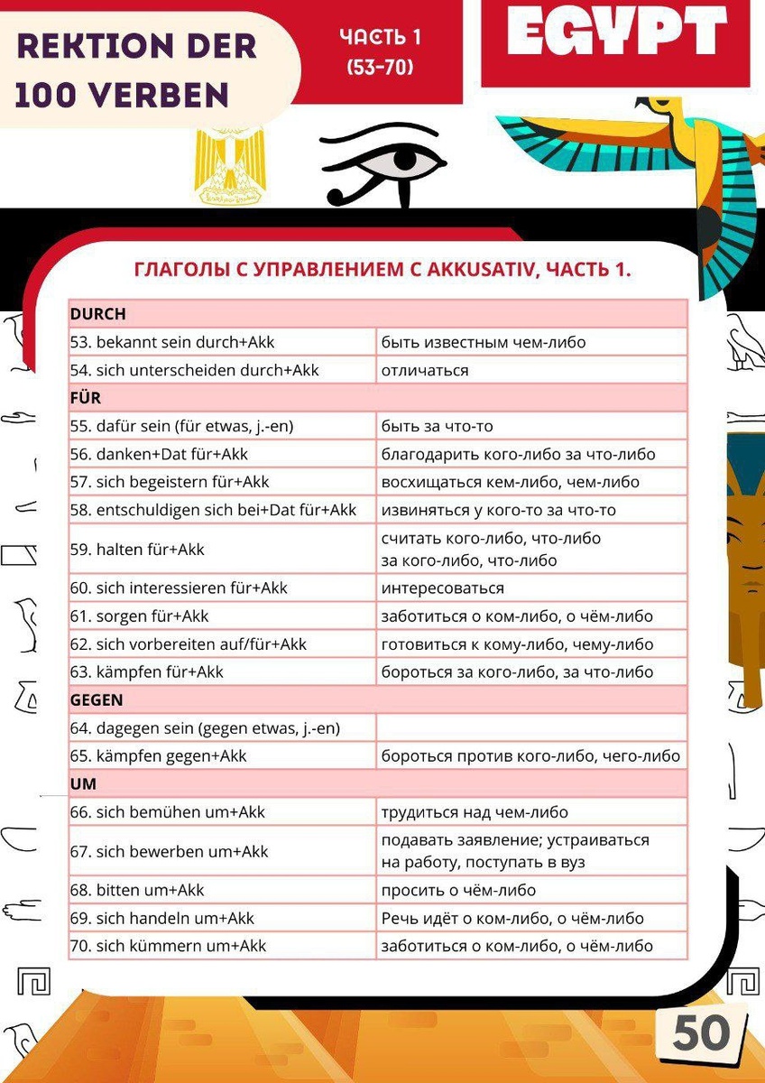 🇩🇪🇩🇪🇩🇪 Уроки немецкого языка со Львом Лучко: "немецкий без воды", управление глаголов с Akkusativ, часть 1. 🇩🇪 Rektionsverben mit Akkusativ. DURCH. 1. bekannt sein durch+Akk быть известным чем-либо FÜR. 1. dafür sein für+Akk быть за кого-то, за что-то 2. sich interessieren für+Akk интересоваться кем-либо, чем-либо 3. sorgen für+Akk заботиться о... GEGEN. 1. dagegen sein gegen+Akk быть против кого-то, чего-то UM. 1. bitten um+Akk просить о чём-либо 2. sich kümmern um+Akk заботиться о ком-либо, о чём-либо ÜBER. 1. sich freuen über+Akk радоваться чему-то совершившемуся 2. vergessen über+Akk забывать о ком-либо, о чём-либо 3. diskutieren über+Akk дискутировать о ком-либо, о чём-либо 4. erfahren über+Akk узнавать о ком-либо, о чём-либо AN. 1. denken an+Akk думать о ком-либо, о чём-либо 2. glauben an+Akk верить в... 3. sich erinnern an+Akk вспоминать о ком-либо, о чём-либо AUF. 1. achten auf+Akk обращать внимание на кого-то, на что-то 2. antworten auf+Akk отвечать на что-либо