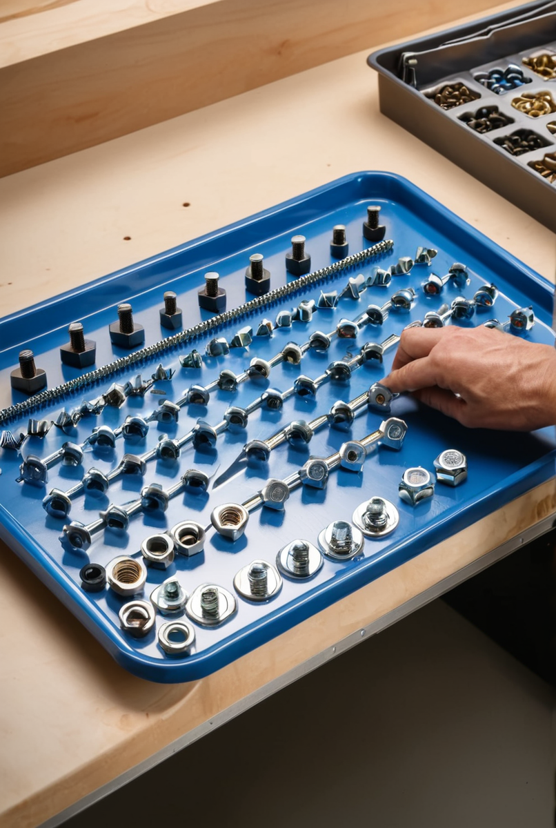 - Проблема: как не терять крепеж, когда мелкие детали, болты, гайки, винты и шайбы создают беспорядок на верстаке в гараже или автосервисе