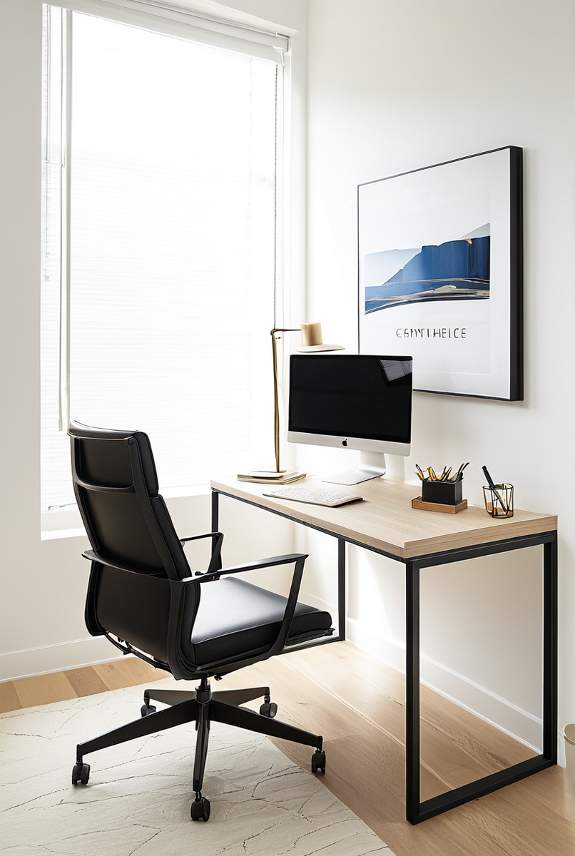 - Минимализм: Предполагает чистые линии и отсутствие лишних деталей. Идеально подойдет стол в цвете белый дуб, который визуально облегчит рабочее место и добавит света.