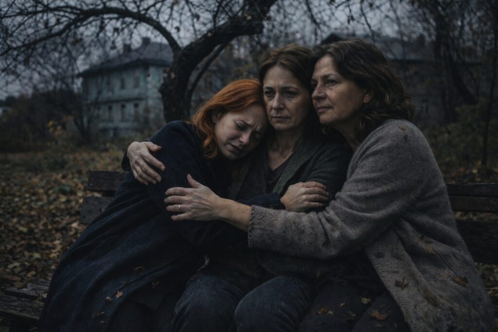Они сидели втроём на старой скамейке — три сестры, три разные судьбы, три разные боли. Над ними шумели ветки яблони, ронявшей последние листья.