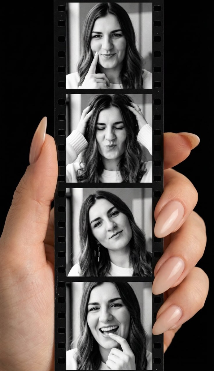 А вы когда ни будь фотографировались в фото будке?😀 Сейчас исправим!😍 Идем в БОТА: 1️⃣ Дизайн с ИИ 2️⃣ Nano Banana PRO Скидываем свое фото и отправляем промт: { "image_description": "A vertical photobooth film strip being held by a hand against a dark background.", "subject": { "expressions": [ "Top frame: Smirking with a finger touching her cheek", "Second frame: Eyes closed, hands in hair, playful expression", "Third frame: Slight head tilt with a subtle, confident smile", "Bottom frame: Laughing with mouth open, finger near lip" ], }, "composition": { "layout": "Vertical film strip with four individual rectangular frames", "foreground": "A hand with long, almond-shaped nude manicured nails holding the bottom left of the strip", "background": "Solid black, high-contrast negative space", "framing": "Close-up portrait shots within the film strip" }, "style_and_aesthetic": { "color_palette": "Monochrome, high-contras