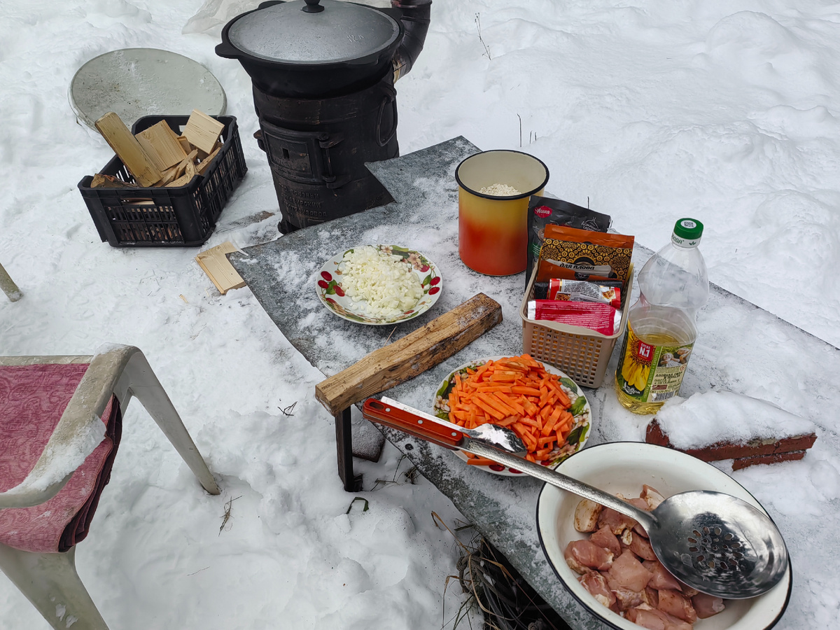 С тех пор, как у нас завелась уличная печка, плов стал одним из универсальных блюд для кормёжки гостей. Поди плохо: сытно, нереально вкусно и весьма обильно – нет переживаний, что кому-то на ночной дожор не хватит. И, доложу я вам, плов, приготовленный в казане на огне даже зимой ни в какое сравнение не идёт с пловом, приготовленным на плите в кастрюле. А запах? Вы обращали внимание, что соседские шашлыки всегда пахнут вкуснее собственных? Так вот плов – это сатисфакция за перенесённые моральные страдания. Потому, что даже собственный плов пахнет так, что обзавидуешься самому себе. На всю улицу аромат. Поначалу я боялась, что в минусовую температуру что-то пойдёт не так: или чугун печки треснет, или казан, или плов не приготовится, как надо. Но опасения оказались напрасными. Несмотря на жарящиеся во фритюре снежинки, бурчащее масло и стремительно остывающие продукты, плов удаётся на славу. Самая низкая из исследованных температур – минус 10. Ниже не пробовали просто потому, что сидеть