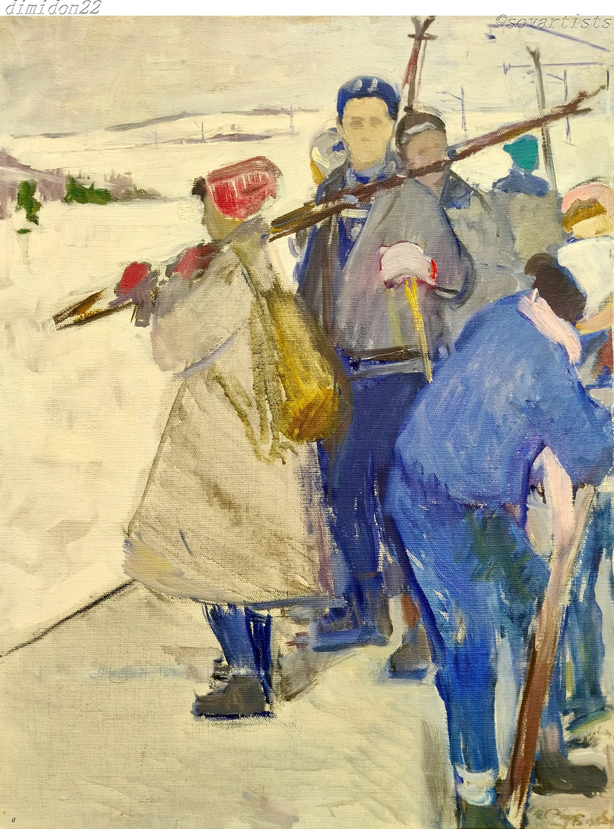 Столбов Александр Сергеевич (05.06.1929, Вятка - 02.11.2021, С.-Пб). «Лыжники». 1961 год. Холст, масло; 59 х 45 см.; (Галерея современного искусства «Красный мост», Вологда). В лыжные походы ходила с друзьями. Здорово было. 10 километров не по лыжне по сугробам. Потом на поляне лавинкой до земли площадку для костра и для квадрата из бревен. И сушины не бензопилой, а двуручной пилой На костре щи да каша - и чай. И обязательно водка, но по чуть-чуть. Назад же ещё идти 10 километров. И не пьянства ради, а здоровья для. А на картине штатские, т. е. не туристы. А мы туристы, водники. Карелия. Ковда.