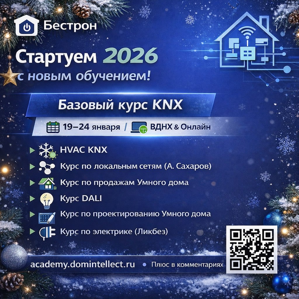 ! 2026 год — активно начать с новых знаний от академии Бестрон: 📆 С 19–24 — Базовый курс KNX в офисе ВДНХ и онлайн! ✍️ Так же идет предзапись на курсы: • HVAC KNX • Курс по локальным сетям (Александр Сахаров) • Курс по продажам Умного дома • Курс DALI • Курс по проектированию Умного дома • Курс по электрике (ликбез) Запись доступна здесь: https://academy.domintellect.ru Либо пишем плюс в комментариях