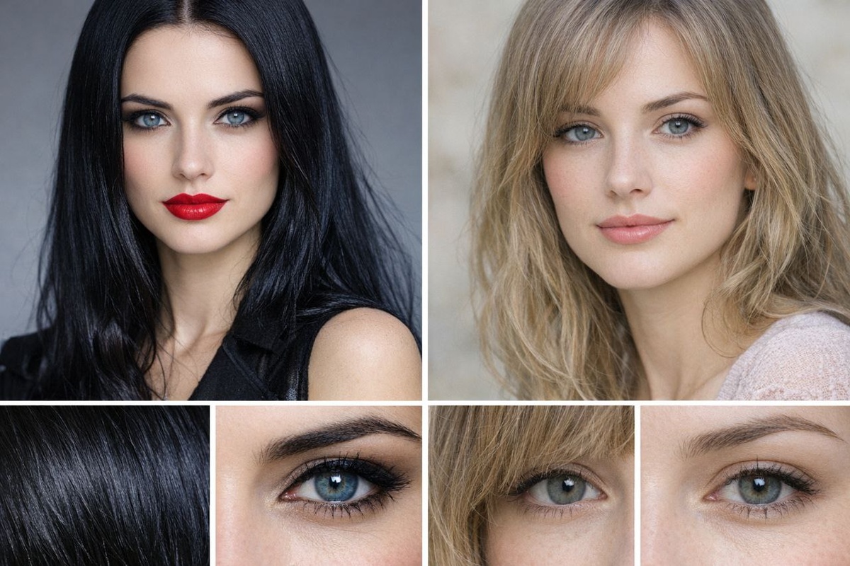 - Контраст: экстремальный (например, чёрные волосы + ледяные голубые глаза).