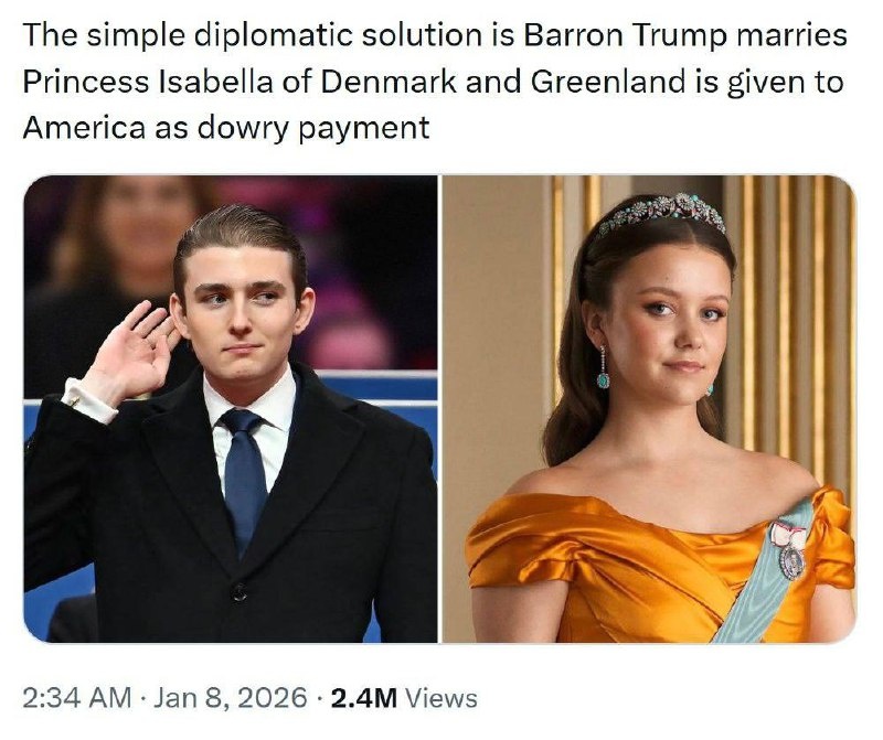 «Простой дипломатический выход из ситуации: если Бэррон Трамп женится на датской принцессе Изабелле и Гренландия будет передана Америке в качестве приданого»