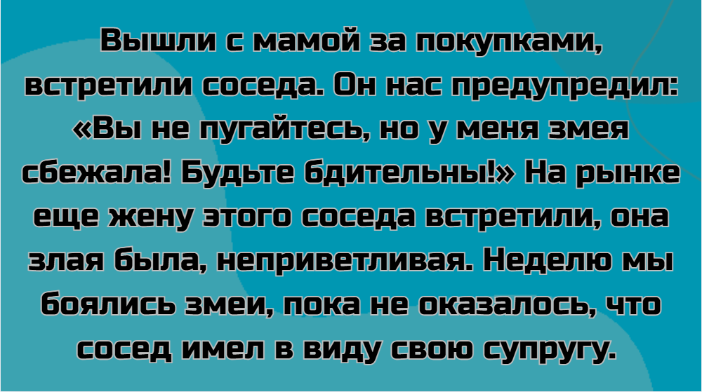 - В соседний дом заселилась новая семья, и хозяйка позвала нас в гости, чтобы познакомиться. Вела она себя очень мило, но потом начались странности. Например, она узнала, что наш отец уехал в длительную командировку заграницу, и начала нам, детям, намекать на то, что он там изменяет нашей маме. И вот папа вернулся. И теперь всякий раз, когда он поливает огород, соседка выносит стул, садится рядом и заводит беседы. Как-то даже предложила сбежать вместе с ней. Папа сто раз давал ей понять, что ему все это не нравится, но как об стенку горох. © thezerofella