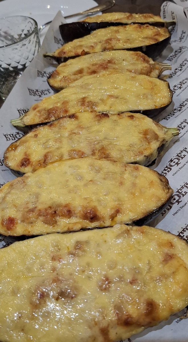 Начали с горячих баклажанов. Но не просто баклажанов, а фаршированных — с сочной мясной начинкой, спелыми помидорами и аппетитной сырной корочкой. Блюдо сразу задало высокую планку: вкусно, сытно