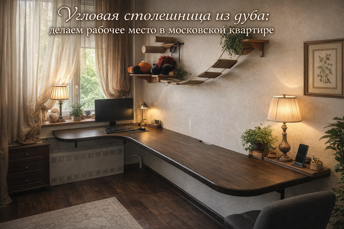Столешница из натурального дерева в угловом исполнении идеально впишется в московскую квартиру: она экономит место и создает эргономичное рабочее пространство в любом интерьере — от сурового лофта с брашировкой до светлого сканди с матовым покрытием и уютного прованса.