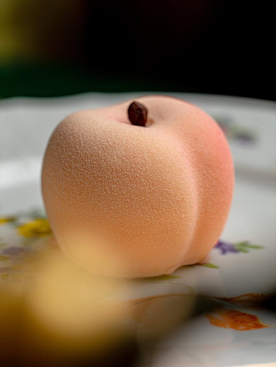 Под тонким слоем бархатного велюра мусс из итальянской меренги, начинка из персикового пюре и ликера.