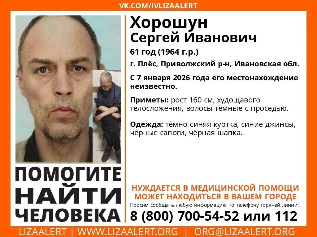 7 января в Плесе пропал 61-летний Сергей Иванович Хорошун. Поисковый отряд «Лиза Алерт» присоединился к поискам и просит жителей региона внимательно изучить ориентировку. Приметы: рост 160 см, худощавого телосложения, волосы темные с проседью. Был одет в темно-синюю куртку, синие джинсы, черные сапоги и черную шапку. Всех, кто видел мужчину или знает, где он может быть, просят звонить по телефону: 8 800 700 54 52 или 112.