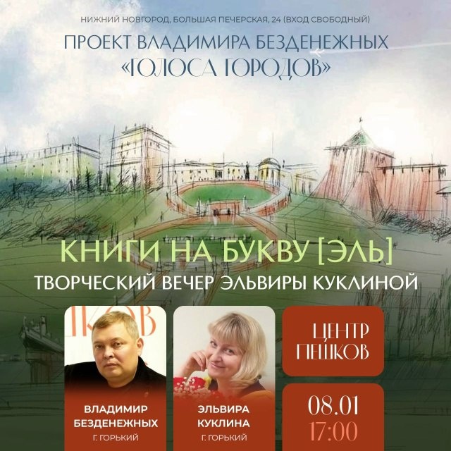 В гостях у Владимира Безденежных — нижегородская поэтесса Эльвира Куклина с новым, пятым по счету, сборником стихов из серии [ЭЛЬ] — «Моя библиотека». Книга посвящена памяти отца автора. Эльвира Куклина родилась в городе Горьком в 1966 году, окончила ННГУ им. Н.И. Лобачевского, филолог. Автор пяти поэтических книг. Лауреат премии Нижнего Новгорода. Публиковалась в журналах «Нижний Новгород», «Аврора», «Север», «Волга», «Двина», «Наш современник», «Смена» и др. Большая Печерская, 24 Начало в 17.00 Вход свободный 😄 Мероприятия Нижний Новгород. Я местный! 📱 Telegram | 📱 MAX