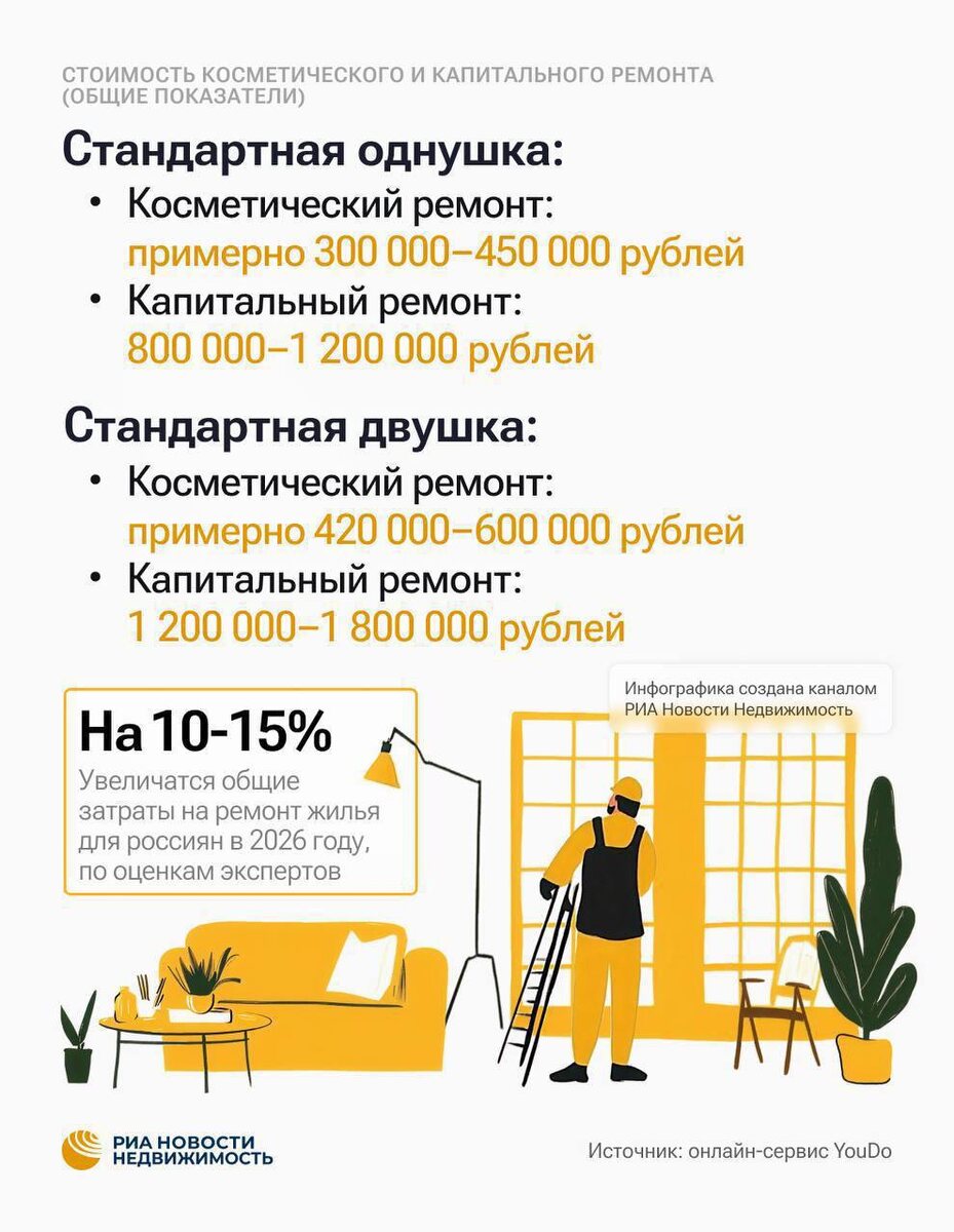 В среднем по стране косметический ремонт однушки обойдётся в 300–450 тысяч рублей, а капитальный — от 800 тысяч до 1,2 млн рублей.