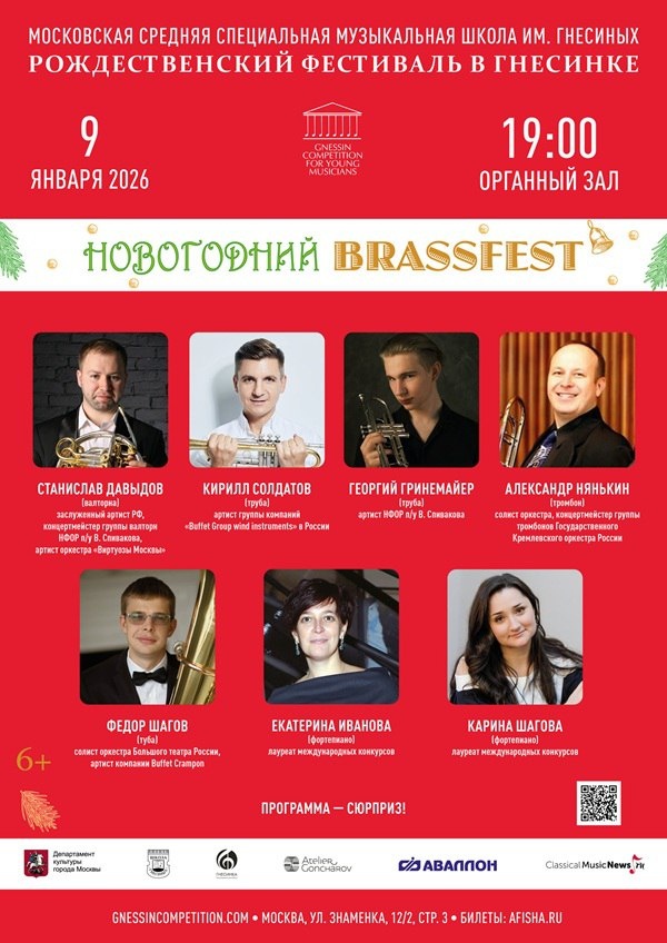» 9 января 2026 в 19.00 уникальный концерт соберет на одной сцене звёзд исполнительского искусства на медных духовых. Вы услышите лучших солистов ведущих отечественных коллективов, таких как Национальный филармонический оркестр России, камерный оркестр «Виртуозы Москвы», Государственный Кремлёвский оркестр и оркестр Большого театра. Программа – сюрприз! В концерте принимают участие: Станислав Давыдов (валторна), заслуженный артист РФ, концертмейстер группы валторн НФОР п/у В. Спивакова, артист оркестра «Виртуозы Москвы» Кирилл Солдатов (труба), артист группы компаний «Buffet Group wind instruments» в России Георгий Гринемайер (труба), артист НФОР п/у В. Спивакова Александр Нянькин (тромбон), солист оркестра, концертмейстер группы тромбонов Государственного Кремлевского оркестра России Федор Шагов (туба), солист оркестра Большого театра России, артист компании Buffet Crampon Партия фортепиано – лауреаты международных конкурсов Екатерина Иванова, Карина Шагова Билеты уже в про