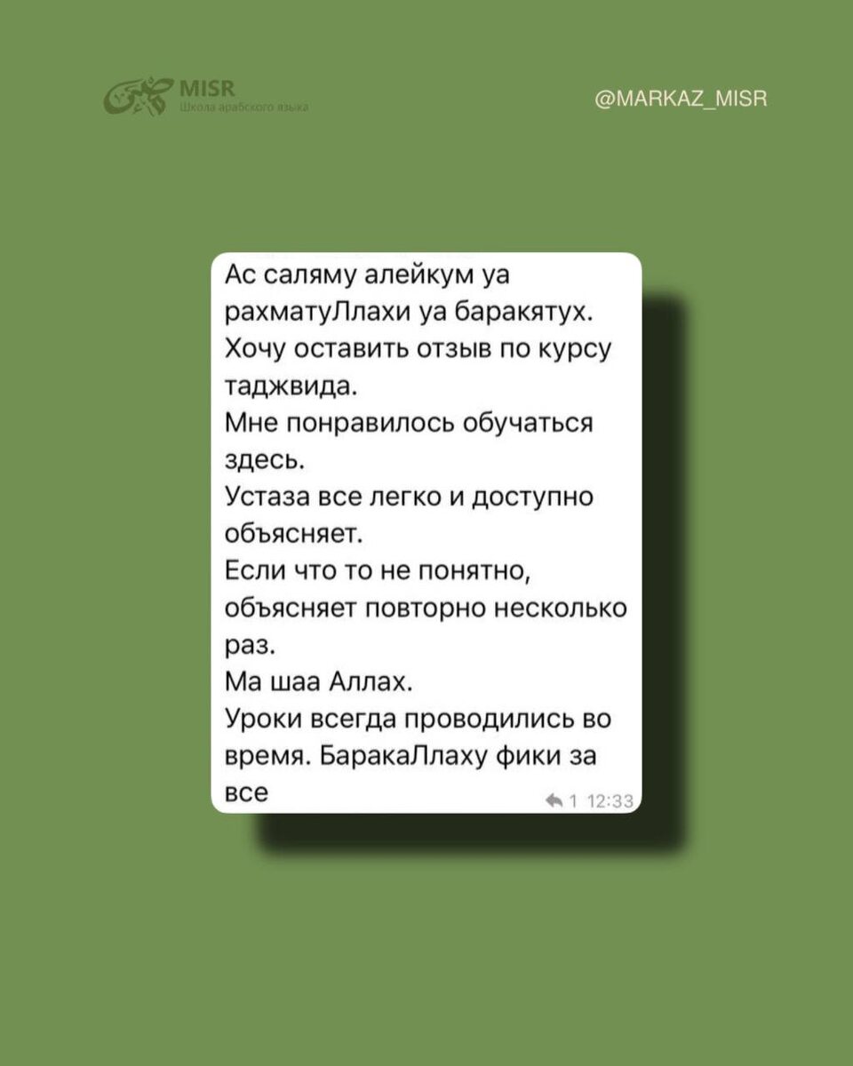 Отзыв одной из студенток Сейчас мы открыли новые наборы на таджвид для сестер. Места уже занимают Есть 2 группы на выбор: ✔️Утренняя группа - понедельник, среда, четверг в 11.00 по Москве Осталось 7️⃣мест ✔️Вечерняя группа - понедельник, среда, пятница в 18.00 по Москве Осталось4️⃣места Подробнее про наборы здесь ➡️Для записи писать сюда @markaz_misr_sestram