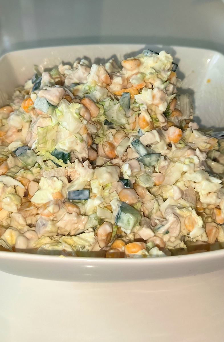 - В большой миске соедините все подготовленные ингредиенты: капусту, курицу, яйца, огурцы и кукурузу.