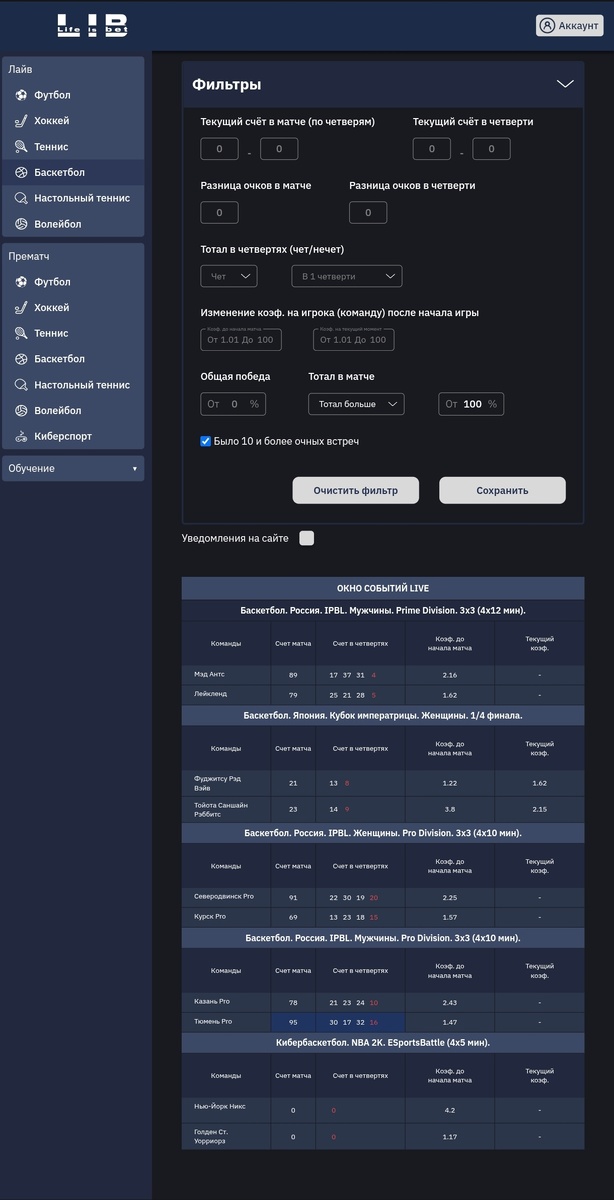 Данная стратегия заключается в поиске матчей лайве, где предлагаемый текущий тотал букмекером в LIVE был "Больше". Для этого заходим на сайт https://lib.bet/, регистрируемся, приобретаем подписку, затем переходим в раздел "Лайв" и выбираем "Баскетбол". Далее настраиваем фильтры, указываем интересующий нас процент, нажимаем кнопку "Сохранить". Затем сканер выдает нам матчи соответствующие нашим настройкам фильтров. То есть сайт выдал матчи в которых текущий тотал (в лайве) в 100% и более случаев был Больше! Далее открываем любой матч из тех, которые для нас отсортировал сканер. Слева видим матч в букмекерской конторе, а справа в сканере LIB. Во вкладке "Статистика H2H" видно, что в 10 последних очных встречах этих команд текущий тотал 106.5 был выше в 100% случаях, при этом средний показатель очных встреч этих двух команд составляет 133,7. В таком случае по логике вещей выгоднее будет сделать ставку на тотал больше 106.5, так как это является более вероятным исходом события. ак же
