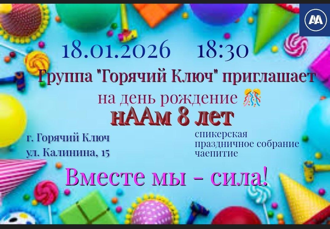 ! 🤍 18 ЯНВАРЯ 2026 — ГРУППЕ АА «ГОРЯЧИЙ КЛЮЧ» ИСПОЛНЯЕТСЯ 8 ЛЕТ! 🤍 Приглашаем вас на праздничное собрание! 🤍 ДАТА: 18 января 2026, воскресенье 🤍 ВРЕМЯ: 18:30 🤍 АДРЕС: г. Горячий Ключ, ул. Калинина, 15, «Центр развития человека» (последняя дверь налево). 🤍 В программе: • Спикерское выступление: история группы, воспоминания о том, как всё начиналось • Праздничное чаепитие • Тёплая и уютная атмосфера Подробности по телефону: 🤍 +7(989)298-40-06 🤍 Группа для связи и информации: https://max.ru/join/7lsVfhju3o9X5TGVrIuqhgzcP8JX4zomNFXJ0MYpT_c Ждём всех на нашем юбилейном собрании!