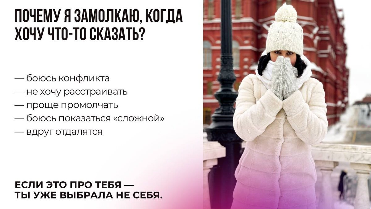 Эти карточки — про те моменты, когда ты впервые выбрала не себя — чтобы сохранить связь, любовь или безопасность. Как с ними работать: ⛔️Не анализируй. ⛔️Не оправдывай. ✔️Просто честно отметь, где ты узнала себя. Мы редко предаём себя резко. Чаще — очень тихо: — промолчали — потерпели — согласились — сделали «как проще» А потом привыкаем жить так, будто это и есть мы. Каждая карточка — это точка, где ты когда-то сделала выбор: ⛔️не потому что хотела, ✔️а потому что иначе было страшно. Важно понять одну вещь: Ты не стала такой случайно. Ты научилась выживать. И если в каких-то ответах ты узнала себя — это не про слабость. Это про опыт. 📱Можешь написать в комментариях номер карточки, которая откликнулась сильнее всего. Или просто сохранить этот пост — чтобы вернуться к нему позже. Быть собой — не риск. Риск — всю жизнь прожить мимо себя 🤍