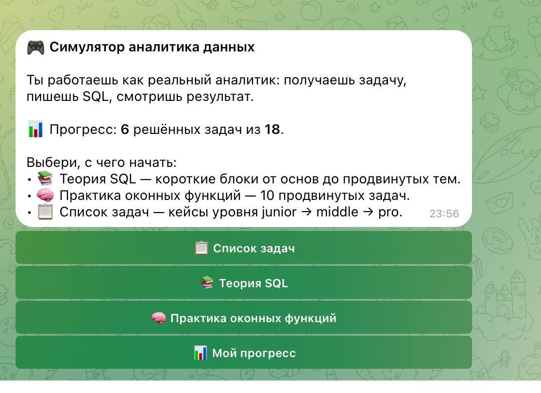 ? Мы запустили полностью бесплатный телеграм-тренажёр 👇 Тебя ждут сценарии, с которыми сталкиваются аналитики каждый день: от простых запросов до задач уровня собеседований. Что внутри: ✔ живые кейсы из реальной практики ✔ удобный симулятор - как работа в компании, только бесплатно ✔ разбор ошибок — понимаешь не только «как», но и «почему» ✔ добавляем задачи с интервью и улучшаем бот вместе с сообществом Начни тренироваться сегодня — и почувствуй уверенность в работе с данными. t.me/Analitics_databot