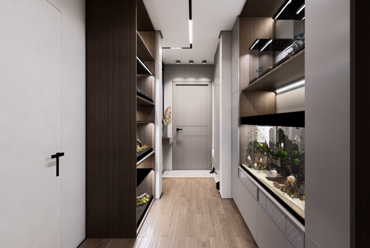 фактуры. В грязной зоне — прочная плитка, остальной пол выполнен из инженерной доски. Так покрытие остаётся тёплым и приятным, даже если за окном ноябрь. Здесь предусмотрено место для аквариума и стоек с террариумами. А под мебелью спрятана база для робота-пылесоса, чтобы он всегда был под рукой, но не на виду. Двери со скрытой коробкой завершают минималистичный облик пространства — чистые линии и максимум порядка с первых шагов в квартиру. #ремонтподключ #дизайнпроект #интерьер #советыдизайнера #ремонт #прихожая