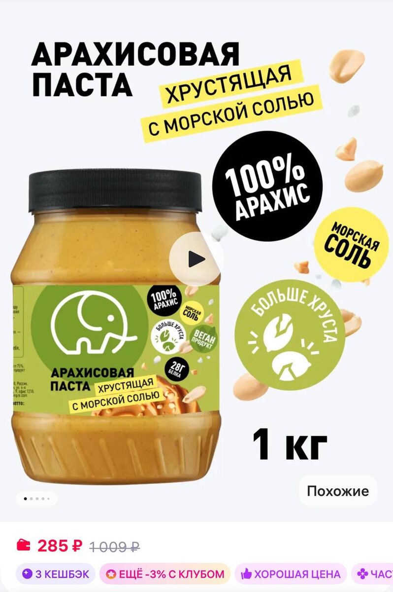 Зеленый слон Арахисовая паста 1 кг хрустящая с кусочками арахиса https://www.wildberries.ru/catalog/110822626/detail.aspx?size=201060929 ✅ Канал по скидкам 🔣 Бот с промокодами