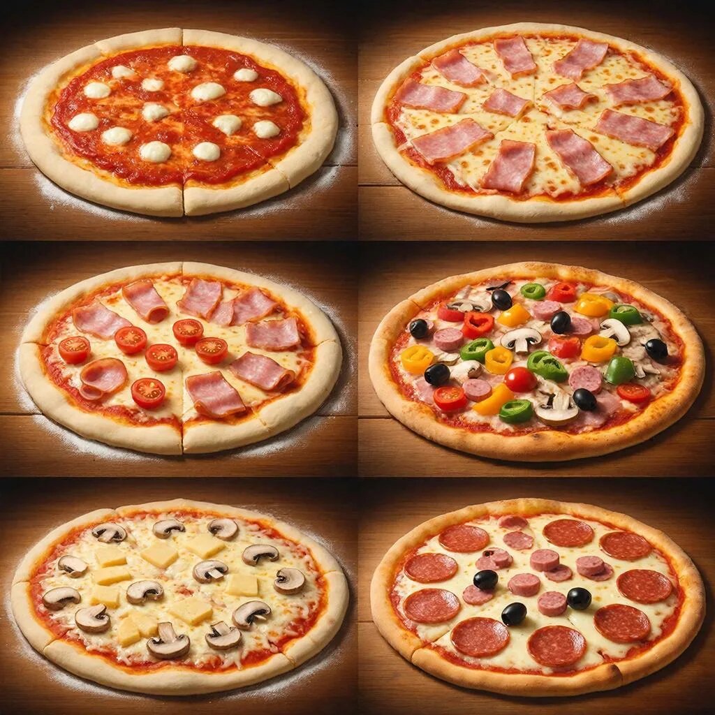 Ингредиенты для пиццы: Для теста: - 300 г муки - 150 мл теплой воды - 1 ч.л. сухих дрожжей - 1 ч.л. сахара - 1 ч.л. соли - 2 ст.л. оливкового масла Для начинки: - 200 г томатного соуса или пасты - 200 г моцареллы (натертой) - 100 г ветчины или пепперони - 100 г свежих грибов (нарезанных) - 100 г болгарского перца (нарезанного) - 50 г маслин (нарезанных) - 2-3 зубчика чеснока (нарезанных) - 1 пучок базилика (для украшения) - Оливковое масло для смазывания Пошаговый рецепт: 1. Приготовление теста: - В миске смешайте муку, дрожжи, сахар и соль. - Добавьте теплую воду и оливковое масло. Замесите тесто. - Вымешивайте тесто на посыпанной мукой поверхности в течение 5-7 минут, пока оно не станет гладким и эластичным. - Сформируйте из теста шар, положите его в миску, накройте полотенцем и оставьте в теплом месте на 1-1,5 часа, чтобы тесто подошло. 2. Подготовка начинки: - Нарежьте ветчину или пепперони, грибы, болгарский перец и маслины. - Нарежьте чеснок и базилик. 3. Формирование пиццы: - Р
