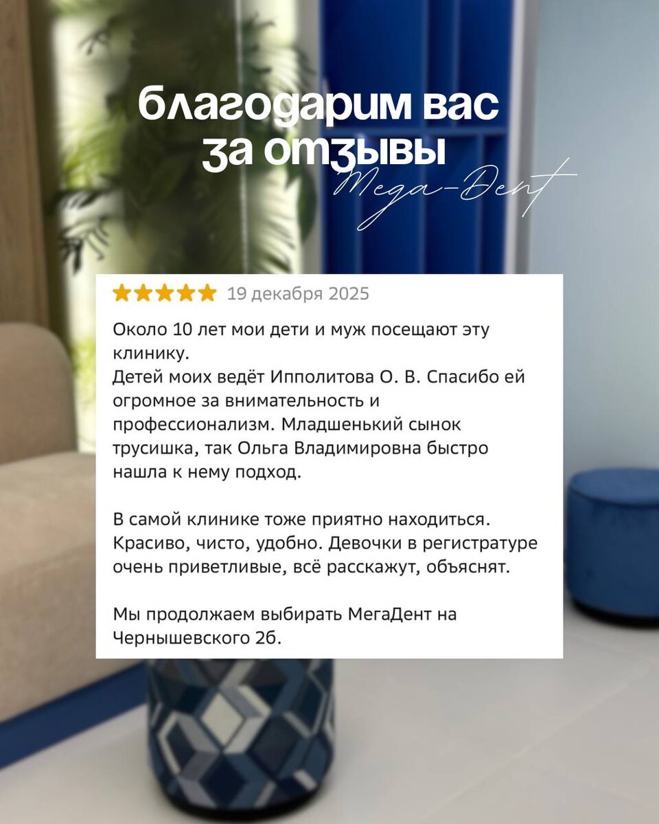 💙 А мы с радостью дарим вам бонусы за отзывы о работе наших профессионалов Как получить бонусы? 1️⃣ Оставить отзыв на любой площадке Yandex карты 2GIS ПроДокторов 2️⃣ А затем направить скрин в наш чат-бот С заботой о вас, Мега-Дент ✨