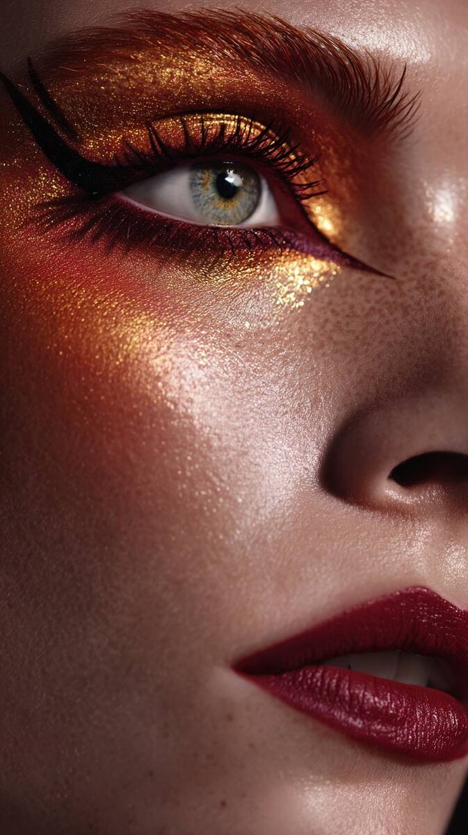 Новогодний вечерний макияж "Огненный феникс". Идеально ровная матовая кожа. Глаза — главный акцент: смоки айс в теплой гамме с градиентом от золота и меди до глубокого терракотового и шоколадного. В центр века нанесена паста с жидким золотым металликом. Широкие, резкие стрелки, накладные ресницы. Брови оформлены гелем. Губы — насыщенный матовый красный с четким контуром. На лбу и скулах — геометричные блики теплого золотого хайлайтера. Факельный свет сбоку создает драматичные тени и подчеркивает текстуру макияжа. Стиль: glamorous, dramatic, warm metallic, high contrast, luxury. --ar 9:16 #MidJourney