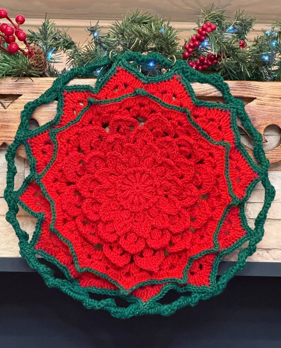 Рождественская звезда или пуансеттия — это панно диаметром 40 см, которое я связала крючком для новогоднего декора