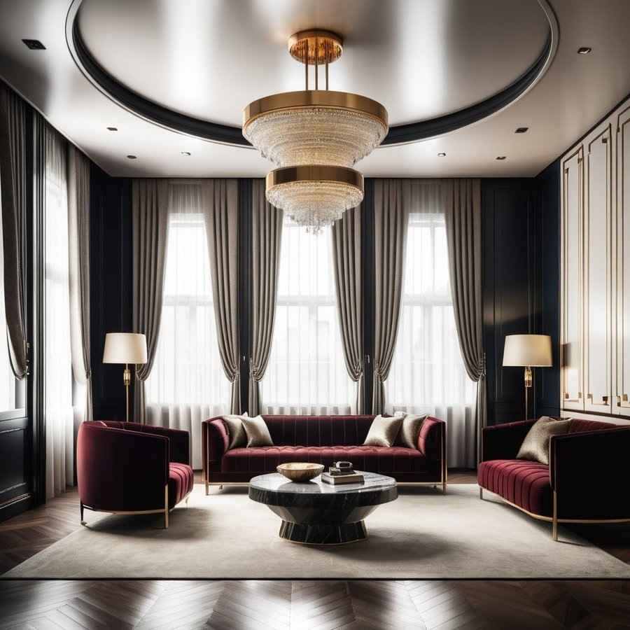В интерьере в стиле ар-деко текстиль и аксессуары играют ключевую роль в создании атмосферы роскоши и уюта. Шелковые и бархатные ткани, обивка мебели с геометрическими узорами, а также декоративные подушки с металлическими акцентами добавляют глубину и текстуру. Использование насыщенных цветов, таких как изумрудный, бордовый и золотистый, усиливает эффект стиля, делая пространство более привлекательным и комфортным.