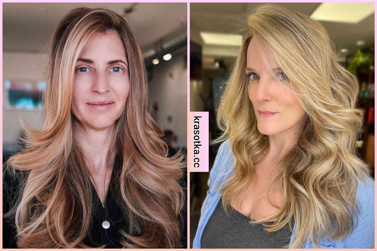 и недостатки. Женщины с более густыми локонами могут испытывать головные боли из-за веса волос. А обладательницам ультратонких локонов они могут показаться плоскими и безжизненными. Поэтому важно выбрать правильную стрижку и делать подходящую укладку. Длинные уложенные волосы идеально подходят для женщин старше 40 с густыми волосами, потому что за ними легче ухаживать, и они сразу придают прическе глубину и стиль. Если у вас своеобразная линия роста волос, попробуйте покрасить корни темнее. Это должно подчеркивать область вокруг глаз, а светлые тона должны оставаться ниже бровей. Длинная прическа и омбре удлинит и уравновесит прямоугольность вашего лица, придав ему моложавый вид. Разделенные на косой пробор волосы - гламурный, женственный и неподвластный времени образ. На данный момент очень модно подстригать их мягкой градуировкой. Светлый балаяж на волнистых локонах с пробором по центру - идеальный способ подчеркнуть длинные волосы. Этот стиль выгодно выразит вашу естественную красо