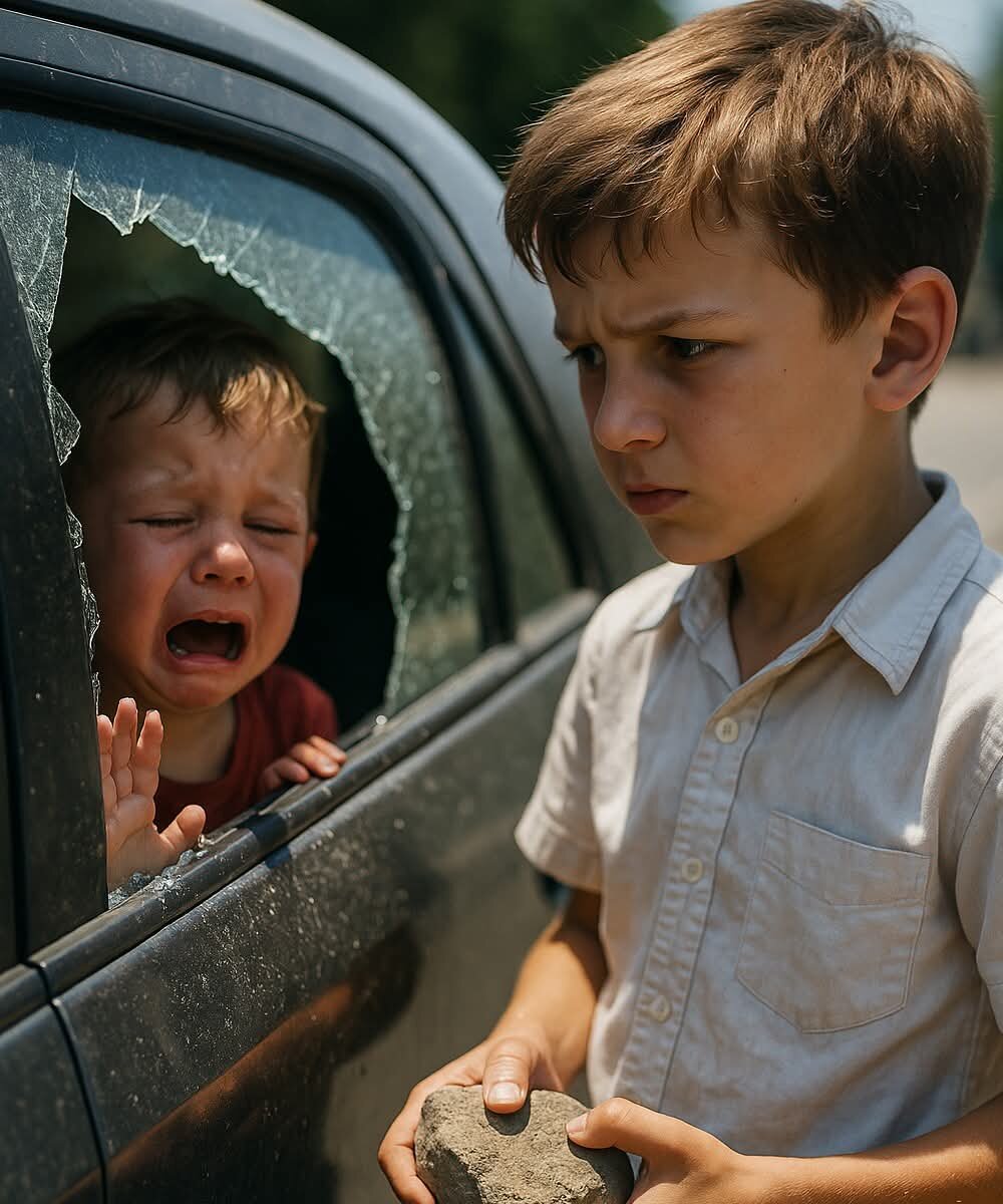 Не раздумывая ни секунды, мальчик схватил с земли тяжёлый камень. Изо всех сил он ударил по стеклу. Окно разбилось, и по улице разнёсся вой автомобильной сигнализации. Он протянул руку внутрь и осторожно вытащил дрожащего ребёнка.