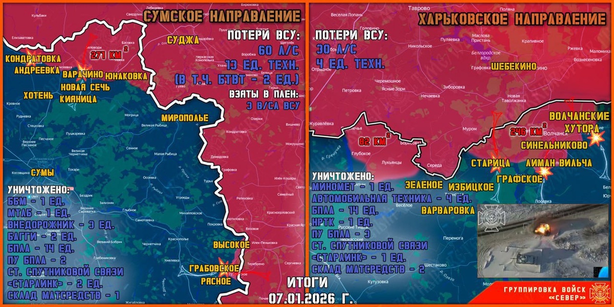 По информации о положении дел на курско-сумском направлении телеграм-канала «Северный Ветер», военные Северной группировки продолжили продвижение на девяти участках фронта, в Краснопольском — на четырех. В плен взято трое солдат ВСУ. Один из них из 253 ошп «Арей», подразделение пыталось удержать Суджу в 2025 году. Общее продвижение военных РФ составило до 700 метров. Как отмечают военкоры, штурмовики РФ сохраняют высокие темпы продвижения в Сумской области. Им помогают «Солнцепеки» и артиллерия, которые точечно работают по целям. Поясняется, что ВСУ продолжает перегруппировку и доукомплектовывает штурмовые и механизированные бригады. Так, понесшую большие потери 1 отмбр ВСУ вывели на восполнение, за исключением батальона, переданного в распоряжение 71 оаэмбр. Стало известно, что командование Киева рассматривает вопрос снятия с должности комбрига полковника Олега Могульского.