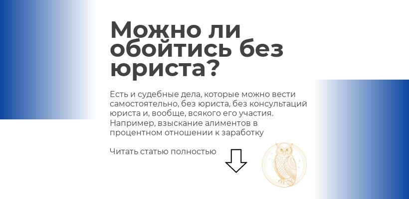 Поговорим о том, когда в делах юридических можно обойтись без юриста, а когда нельзя. Вообще, считаю, что многие правовые вопросы можно решать самостоятельно, без обращения к профессиональной юридической помощи. Достаточно почитать закон, немного вникнуть в суть нормы закона и - вперед. Как мы обходимся без врача при лечении обыкновенной простуды, так и вполне можно обойтись без юриста при решении обыкновенных правовых вопросов. Например, заключение договора аренды квартиры. Не думаю, что надо каждый раз привлекать юриста к составлению и заключению этого договора. Если есть шаблон, можно самостоятельно поменять данные, подписать договор и спать спокойно. Есть и судебные дела, которые можно вести самостоятельно, без юриста, без консультаций юриста и, вообще, всякого его участия. Например, взыскание алиментов в процентном отношении к заработку, развод в судебном порядке, несложные случаи взыскания долга, когда, например, есть договор и расписка.