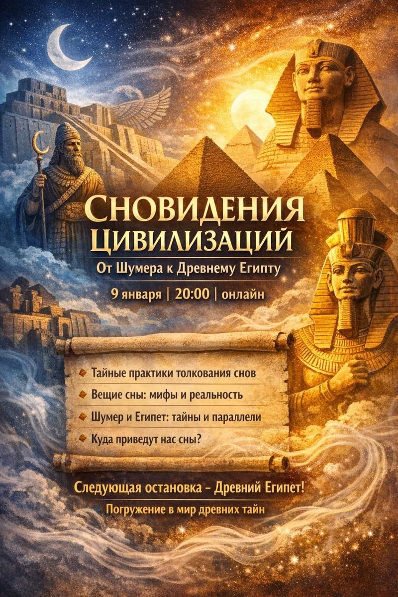От Шумера к Древнему Египту 9 января | 20:00 | онлайн Вы знали, что первый сонник был написан 5000 лет назад? Не Фрейд придумал толковать сны. И не Юнг. Это делали жрецы Вавилона — задолго до того, как появились пирамиды. Три месяца мы исследовали, как древние работали со снами, знаками судьбы и внутренними демонами. Оказалось — они знали о нас больше, чем мы думаем. На семинаре: — Как в древности лечили через сны (и почему это работает до сих пор) — Какие шумерские практики можно использовать сегодня — Что общего между Месопотамией и Египтом — Куда мы отправимся дальше 📍 СЛЕДУЮЩАЯ ОСТАНОВКА — ДРЕВНИЙ ЕГИПЕТ 12 недель погружения в культуру, где сон и смерть были близнецами, а фараоны строили пирамиды как машины воскрешения. План на 3 месяца: • Неделя 1–3: Сновидения, знаки, целительство через сны • Неделя 4–6: Транс, священная сексуальность, работа с тенью • Неделя 7–9: Восстановление сна, процветание, путь самореализации • Неделя 10–12: Священная космология и интеграция Каж