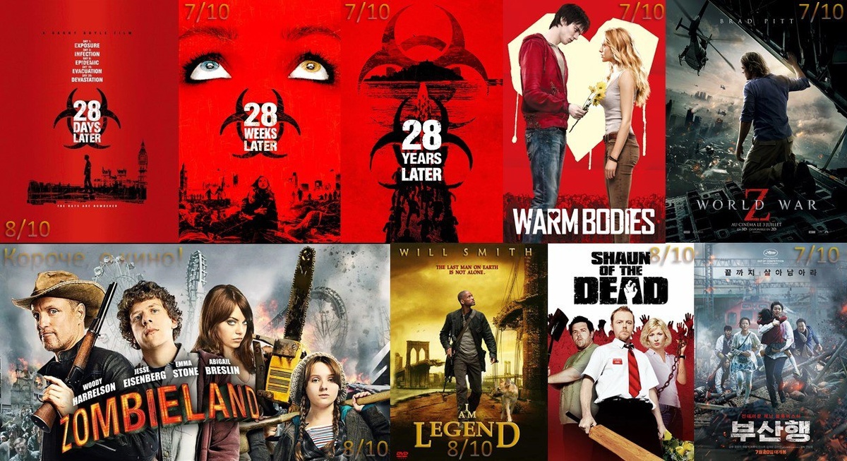 Вне рейтинга: 1. 28 дней спустя/28 Days Later 2002 Моя оценка: 8 из 10 Рейтинг на КП/IMDb: 7.4/7.5 2. 28 недель спустя/28 Weeks Later 2007 Моя оценка: 7 из 10 Рейтинг на КП/IMDb: 7.0/6.8 3. 28 лет спустя/28 Years Later 2025 Моя оценка: 7 из 10 Рейтинг на КП/IMDb: 6.1/6.6 Франшиза зомби-апокалипсиса, изменившая жанр, а возможно и весь мир кино. Рейтинг 1. Я — легенда/I Am Legend 2007 Моя оценка: 8 из 10 Рейтинг на КП/IMDb: 7.9/7.2 Психологический триллер про одиночество и надежду на фоне апокалипсиса. 2. Добро пожаловать в Zомбилэнд/Zombieland 2009 Моя оценка: 8 из 10 Рейтинг на КП/IMDb: 7.4/7.5 Экшен комедия про правила и ситуации, когда их стоит нарушить. 3. Зомби по имени Шон/Shaun of the Dead 2004 Моя оценка: 8 из 10 Рейтинг на КП/IMDb: 7.3/7.8 Британский юмор, ирония и сарказм вперемешку с живой мертвечиной. 4. Тепло наших тел/Warm Bodies 2023 Моя оценка: 7 из 10 Рейтинг на КП/IMDb: 6.9/6.8 Необычный роман на руинах цивилизации, где заражённость — не приговор. 5. Война миров Z