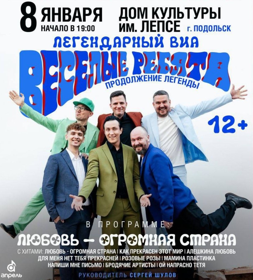 ✨ ‼️‼️‼️‼️‼️‼️ ВАЖНО, НИЖЕ СДЕЛАЛИ ПОСТ, О ТОМ, ЧТО НЕ БУДЕТ СЕГОДНЯ БЕСПЛАТНОГО КОНЦЕРТА Приглашаем на бесплатный концерт 🎶 ВИА "Веселые ребята" Программа «Любовь – огромная страна» подарит вам море ностальгии и тепла. Вас ждут любимые хиты, которые звучали в каждом доме, исполненные с живым звуком для настоящего драйва и глубины эмоций: 🎶 «Любовь – огромная страна» 🎶 «Как прекрасен этот мир» 🎶 «Алёшкина любовь» 🎶 «Розовые розы» 🎶 «Мамина пластинка» …и многие другие! 🚫 Возраст: 12+ 📆 08.01.2026 🕒 19:00 🏢 Дом культуры им. Лепсе 📍 г. Подольск, Революционный просп., 27 💰 Вход свободный❗️ ⭐Поддержать канал голосом 🍰Где поесть в Подольске ✅ Мероприятия Подольск https://dzen.ru/id/66ed500f7b5671493eca3fd6 http://vk.com/podolsk_events http://dzen.ru/podolsk_events