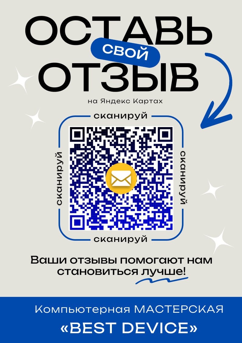 ! 🛡 Помогите другим не ошибиться с выбором. Расскажите на Яндекс Картах, как мы починили ваш ПК или ноутбук. Это займёт минуту, а поможет многим! Сканируй QR-код или переходи по ссылке https://yandex.ru/maps/org/best_device/167879498912/reviews/?add-review=true
