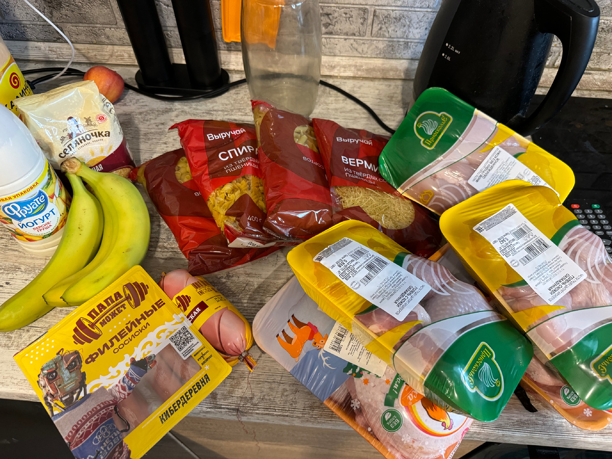 Оформила заказ на 1950р, 1000р вернулась, купила мяса в морозилку, в моей семье все мясоеды, поэтому не пропадет точно! Бакалею пополнила макаронами и кукурузной крупой на каши, йогурт детям на вечер, сосиски и колбасу на завтрак. Считаю, что удачно вышло на 950р-то) сделала еще один