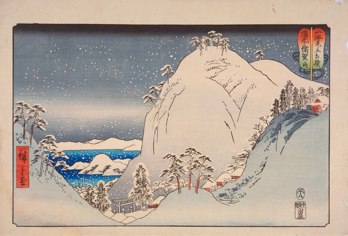 Ключ к пониманию этой гравюры лежит в самом названии серии «Состязание сумо между горами и морями» (山海見立相撲), где каждая гравюра — это воображаемый поединок, где природа выходит на арену, а зритель становится судьёй. Названия серии вписаны в ярко-красный гумбай (軍配) — традиционный военный веер, которым судья на ринге подает сигналы и объявляет победителя. Этим жестом художник, как бы обращается к зрителю: «Ты здесь — судья. Реши сам — кто сильнее?» На гравюре «Гора Югасан в провинции Бидзэн» (備前偸賀山) снег ложится тяжёлым покровом, усиливая ощущение массы и тишины. Гора, как могучий борец, море принимает её вес, не уступая. У подножия — ворота тории, словно вход на арену, а на склоне — крошечные домики, безмолвные зрители схватки стихий. Работа была создана в 1858 году — в год эпидемии холеры, которая унесла жизнь великого мастера укиё-э Утагава Хиросигэ (歌川广重, 1797-1858). Его прощальная серия превращает природу в театр, где человек — лишь свидетель вечного поединка, продолжающегося уже б