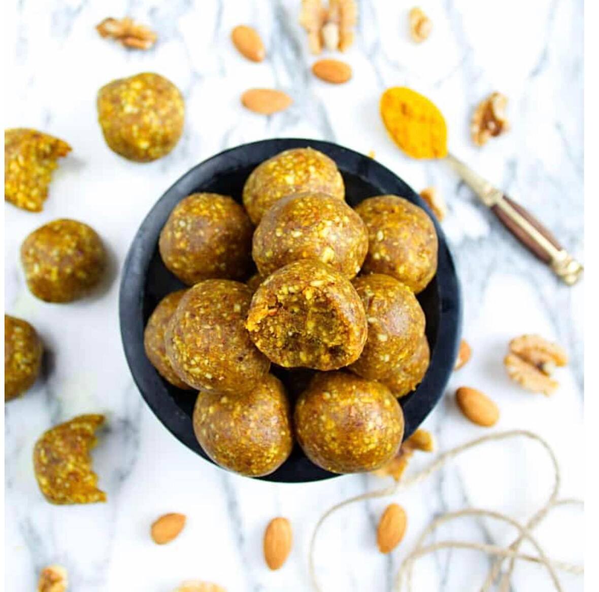 Чтобы поддержать иммунитет и поднять настроение, предлагаем вам рецепт сладостей, которые не только порадуют своим вкусом, но и принесут пользу вашему здоровью. Конфеты ᥴ ᥙʍδᥙρᥱʍ ᥙ κуρκуʍ᧐ᥔ ⚖️Ингредиенты (выход: ~12-14 шариков): Ореховая основа: • Миндаль — 70 г • Кешью — 70 г • Фундук — 20 г (по желанию, для дополнительного вкуса) Связующая часть и вкус: · Финики без косточек — 120 г (это примерно 6-8 крупных фиников) · Имбирь молотый — 2-3 г (½ ч.л., можно заменить на 10 г свежего тертого имбиря) · Куркума молотая — 2-3 г · Цедра одного небольшого лимона — около 5 г (с цедры 1 лимона) · Сок лимона — 5 мл · Вода — 15 мл (1 ст.л., при необходимости можно добавить еще) · Для обсыпки (по желанию): · Кунжут, мак, кокосовая стружка — 30-40 г 1. Если финики не очень мягкие, залейте их горячей водой на 10 минут для смягчения, затем слейте воду и промокните бумажным полотенцем. Удалите косточки, если они есть. 2. В чашу кухонного комбайна поместите миндаль , кешью и фундук . Измельчайте