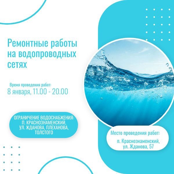 Срок производства работ продлён до 22.00 Ремонт сетей водоснабжения в посёлке Краснознаменский В связи с проведением аварийно-восстановительных работ на сетях холодного водоснабжения диаметром 150 мм (ул. Жданова, 57) 8 января, 11.00 - 22.00 отключена вода по адресам: п. Краснознаменский, д.1, 14, 15, 18, 2, 25, 31, 4, 5, 56, 57, 58, 59, 6, 8, 9, 93, 94, 95, 96; ул. Жданова, д. 19, 8, 30Б; ул. Плеханова, д. 10; ул. Л.Толстого, д. 17, 18, 20, 24к1, 7. Подвоз воды: с 17.00 до 22.00, п. Краснознаменский, ул. Жданова, д. 19а. Приносим извинения за доставленные неудобства. Телефон аварийно-диспетчерской службы водоканала: 84965621172.