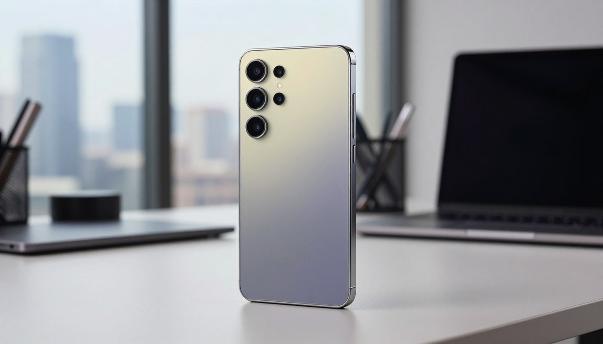 На переднем плане - стильный смартфон Samsung Galaxy S24 Ultra, демонстрирующий элегантный дизайн и расширенные возможности. Телефон следует расположить под небольшим углом, чтобы запечатлеть мерцающую заднюю панель из стекла и четырехъядерную камеру, динамично отражающую свет. В качестве промежуточной точки используйте незначительные технические детали, такие как значки, отображающие ключевые характеристики (качество камеры, время автономной работы, разрешение дисплея), которые слегка размыты на заднем плане. Обстановка представляет собой современную офисную среду с мягким естественным освещением, проникающим через большие окна, что создает яркую и в то же время профессиональную атмосферу. Изображение передает инновационный и премиальный характер, побуждая зрителей познакомиться с новейшим флагманским смартфоном. Убедитесь, что в композиции нет наложений текста или отвлекающих факторов.