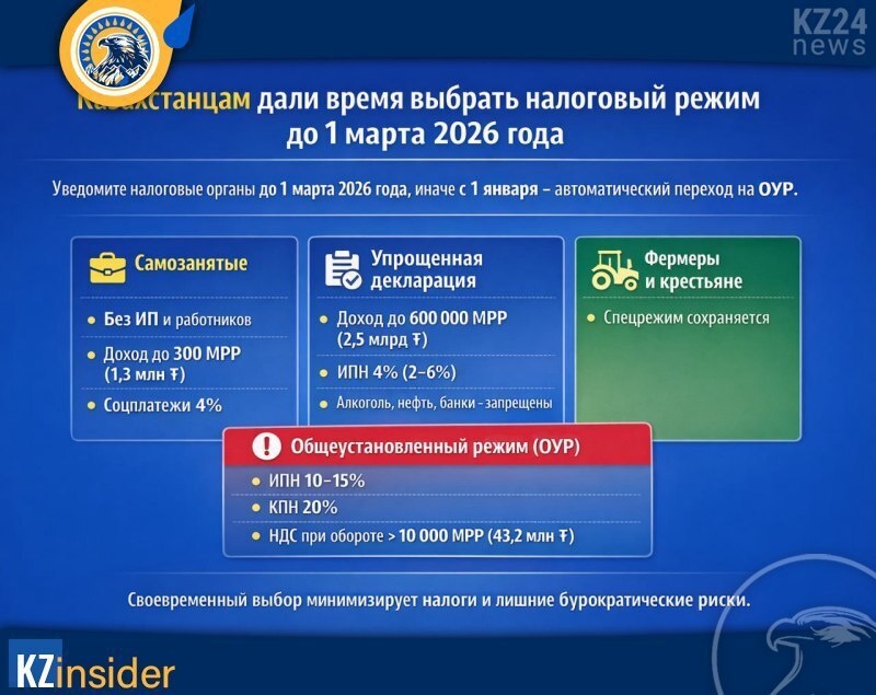 Каждый предприниматель должен уведомить налоговые органы о выборе налогового режима до 1 марта 2026 года. Если не успеть — бизнес автоматически перейдет на общеустановленный режим (ОУР) с 1 января 2026 года. Сменить режим можно только в начале следующего года. ✅ Самозанятые — без ИП и работников, доход до 300 МРП (1,3 млн ₸), соцплатежи 4%, учет через E-Salyq Business. ✅ Упрощенная декларация — для малого бизнеса, доход до 600 000 МРП (2,5 млрд ₸), ИПН 4% (2–6%), запрещены алкоголь, нефть, банки, строительство и др. ✅ Крестьянские и фермерские хозяйства — сохраняется спецрежим. ✅ ОУР — базовый, сложный, ИПН 10–15%, КПН 20%, плюс НДС при обороте >10 000 МРП (43,2 млн ₸).