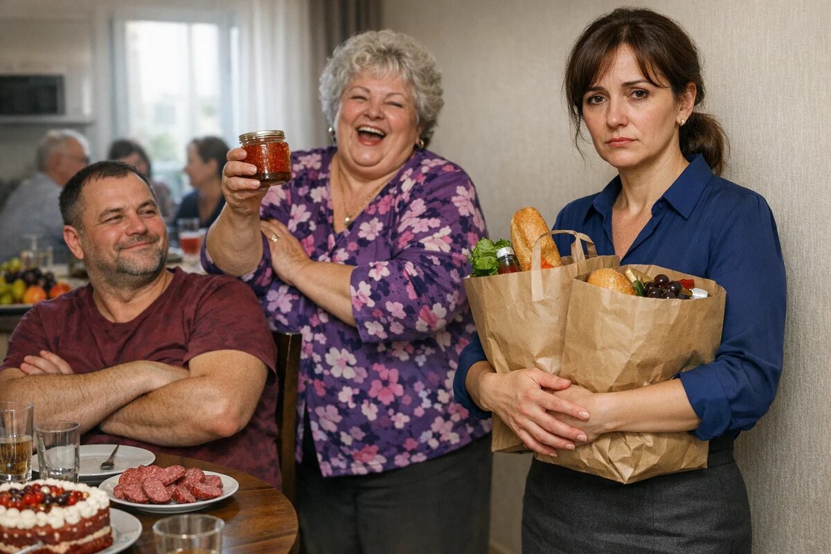 Анна стояла с пустыми пакетами в руках. Смотрела на мужа, на свекровь, на гостей. Потом тихо сказала: