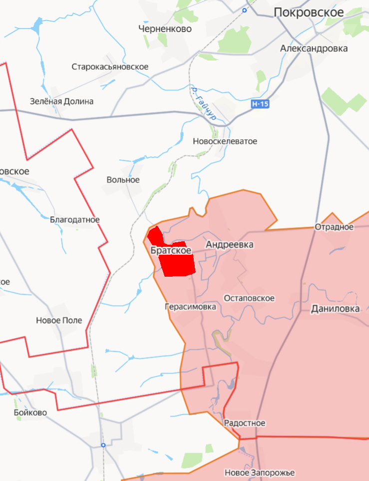 - Освобождено село Братское, Екатеринославской области (Запорожский фронт, Терноватовское направление, зона ответственности группировки войск "Восток"). - 34-ый освобождённый населённый пункт Екатеринославской области. Наиболее крупное село из тех, что находятся за Гайчуром и подконтрольны ВС РФ. С рубежа Братское-Заречное можно развивать атаки далее в сторону Нового Поля и Христофоровки, что вкупе с действиями наших бойцов южнее (в районе Косовцево) будет означать формирование охвата у ключевого для направления посёлка Терноватое (он не подписан на приведённой карте, расположен в её нижней части, вокруг ж/д станции, обозначенной маленьким сине-белым кружком). Освобождение подтверждено демонстрацией флага РФ в центре села.