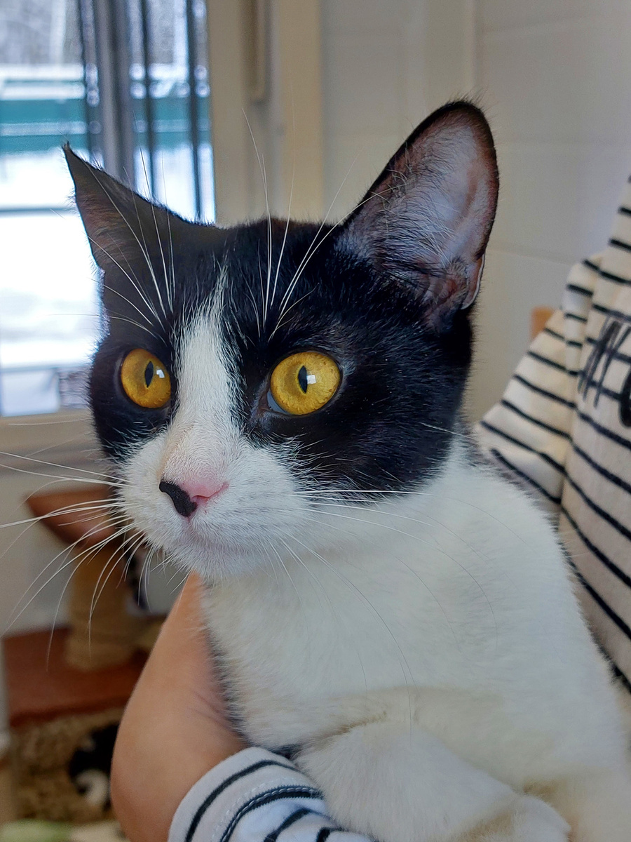 Встречайте Клио – музу, сошедшую со страниц древнегреческих мифов прямиком в уютные стены приюта, готовую вдохновить вас на новую главу в вашей жизни. Имя, говорящее само за себя, намекает на ее артистичный и любознательный нрав. Клио – молоденькая кошечка, чей черно-белый наряд напоминает о вечной гармонии противоположностей, а любопытство в ее больших желтых глазах горит ярче звезд. Эта маленькая богиня истории жаждет познавать мир, с энтузиазмом исследует каждый уголок, с интересом наблюдает за окружающими. Ее взгляд, полный неподдельного восторга, способен растопить любое сердце. А смешное пятнышко на носу придает ей особенный, неповторимый шарм, делая Клио не просто красивой кошкой, а настоящей индивидуальностью. Клио — это кошка-компаньон, кошка-друг, кошка, которая наполнит ваш дом весельем и позитивом. Она обожает играть, мурлыкать ласковые песенки и дарить теплые объятия. Клио станет источником вдохновения и радости для всей вашей семьи. Она мечтает о доме, где ее будут любить